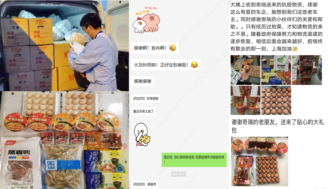 此外,在至今仍牵动全国人民关心的上海,为缓解各用户、合作伙伴因封控带来的物资短缺困境,奇瑞同样多方协调努力,分拣、打包、装箱、贴条、装车,运输……将丰富的物资和拳拳的心意一起送到伙伴们的手中。